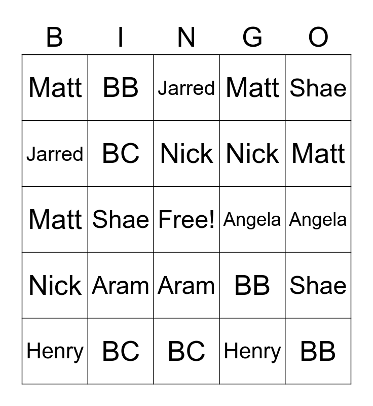 This bingo card has a free space and 24 words: Aram, BC, Nick, Henry, Shae, Matt, Jarred, BB, Angela, Aram, Nick, Matt, BB, Shae, BC, Henry, Angela, Jarred, Matt, Shae, BB, Nick, Matt and BC.