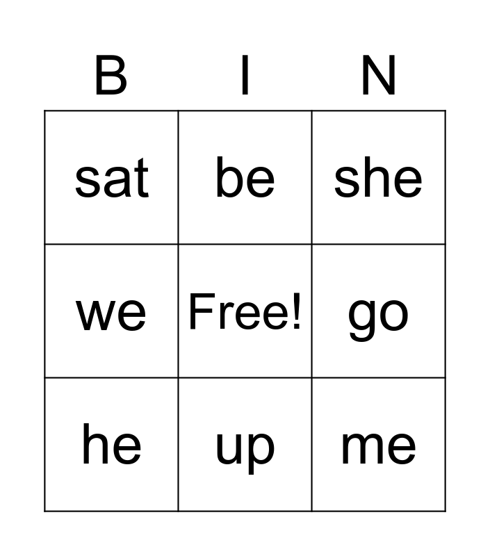 This bingo card has a free space and 11 words: us, up, me, he, be, she, go, so, we, sat and day.
