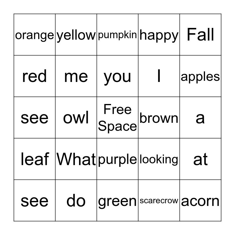 This bingo card has a free space and 24 words: What, do, you, see, Fall, orange, red, yellow, brown, purple, I, see, looking, at, me, scarecrow, a, pumpkin, apples, owl, acorn, leaf, happy and green.