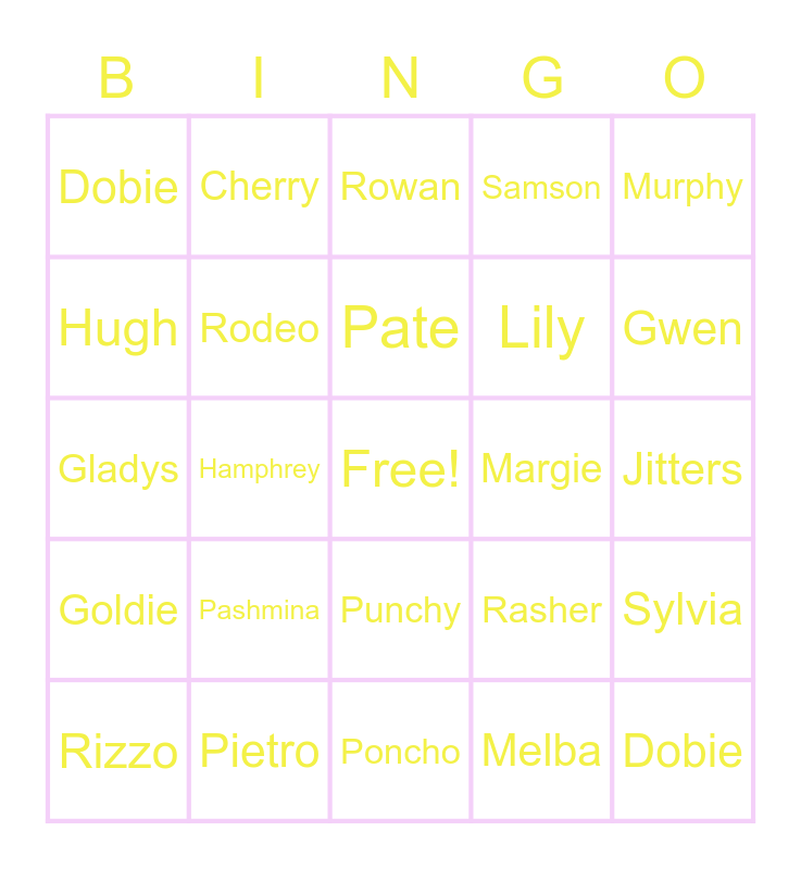 This bingo card has a free space and 128 words: Zucker, Cherry, Wart Jr., Nanna, marina, Octavian, Goldie, Astrid, O'Hare, Gloria, Gonzo, Kitt, Hamlet, Patty, Deirdre, Ellie, Poncho, Ursula, Sprinkle, Vesta, Monty, Lily, Rolf, Puddles, Colton, Graham, Dobie, Drago, Egbert, Flurry, Gladys, Hamphrey, Hazel, Iggly, Keaton, Lopez, Goldie, Doc, Louie, Marcie, Margie, Marshall, Marina, Mitzi, Ozzie, Hippeaux, Peewee, Pashmina, Pompom, Rasher, Raymond, Rizzo, Scoot, Savannah, Shep, Shari, Teddy, Sylvana, Walker, Vladimir, Zell, Winnie, Yuka, Whitney, Willow, Dobie, Curly, Curlos, Gwen, Hugh, Jay, Jitters, Judy, Julia, Kyle, Leopold, Lucy, Lyman, Mac, Maddie, Melba, Murphy, Nan, Nana, Pate, Piper, Pietro, Portia, Prince, Puck, Puddles, Pudge, Punchy, Queenie, Ricky, Roald, Rod, Rowan, Rodeo, Ruby, Samson, Sally, Savannah, Sprinkle, Sylvia, Tabby, Tucker, Tybalt, Tutu, Wolfgang, Ribbot, Rhonda, Octabvian, Naomi, Nate, Klaus, Knox, Kody, June, Julian, Kabuki, Genji, Gigi, Frobert, Frida, Friga, Cesar and Bubbles.