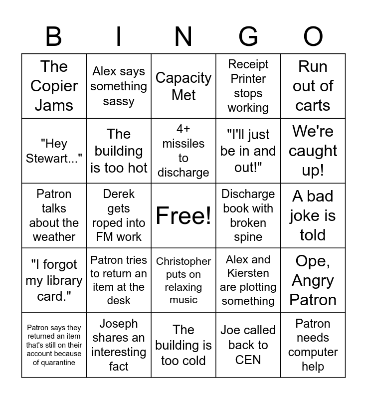 This bingo card has a free space and 24 words: Patron tries to return an item at the desk, Joseph shares an interesting fact, 4+ missiles to discharge, Patron says they returned an item that's still on their account because of quarantine, Run out of carts, The Copier Jams, "Hey Stewart...", Alex says something sassy, Discharge book with broken spine, Christopher puts on relaxing music, "I'll just be in and out!", Patron talks about the weather, Alex and Kiersten are plotting something, Ope, Angry Patron, The building is too hot, Joe called back to CEN, A bad joke is told, Capacity Met, We're caught up!, Derek gets roped into FM work, Patron needs computer help, "I forgot my library card.", Receipt Printer stops working and The building is too cold.
