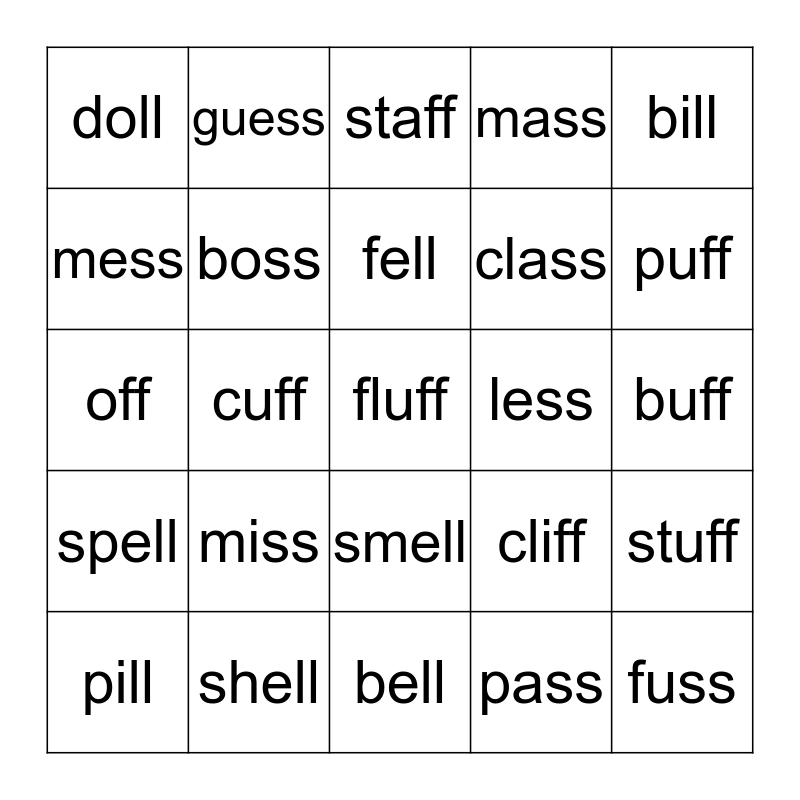 This bingo card has 25 words: miss, bell, fell, pill, bill, doll, mess, guess, less, smell, class, off, cliff, stuff, boss, fuss, buff, staff, puff, cuff, fluff, shell, spell, mass and pass.