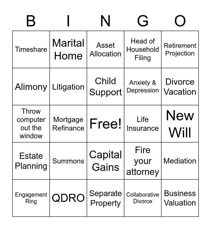 This bingo card has a free space and 24 words: Summons, QDRO, Child Support, Engagement Ring, Retirement Projection, Timeshare, Alimony, Marital Home, Life Insurance, Capital Gains, Anxiety & Depression, Throw computer out the window, Fire your attorney, Mediation, Litigation, Collaborative Divorce, New Will, Asset Allocation, Divorce Vacation, Mortgage Refinance, Business Valuation, Estate Planning, Head of Household Filing and Separate Property.