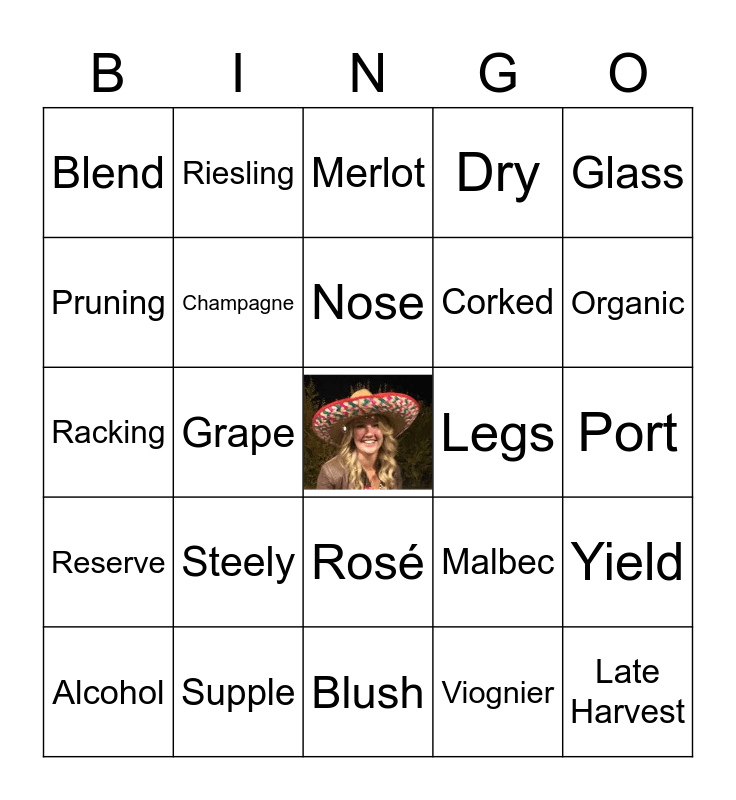 This bingo card has a free space and 56 words: Acidity, Alcohol, Aroma, Blend, Blush, Body, Champagne, Chardonnay, Corked, Dosage, Dry, Fermentation, Filtration, Fruit, Gamay, Gewürztraminer, Glass, Grape, Ice Wine, Late Harvest, Legs, Magnum, Malbec, Merlot, Muscat, Nose, Oaky, Orchard, Organic, Oxidized, pH, Pinot Blanc, Pinot Gris, Pinot Noir, Port, Pruning, Racking, Red, Reserve, Riesling, Rosé, Sauvignon Blanc, Sherry, Shiraz, Sommelier, Steely, Supple, Table Wine, Tannins, Tasting, Viognier, White, Winery, Yeast, Yield and Zinfandel.