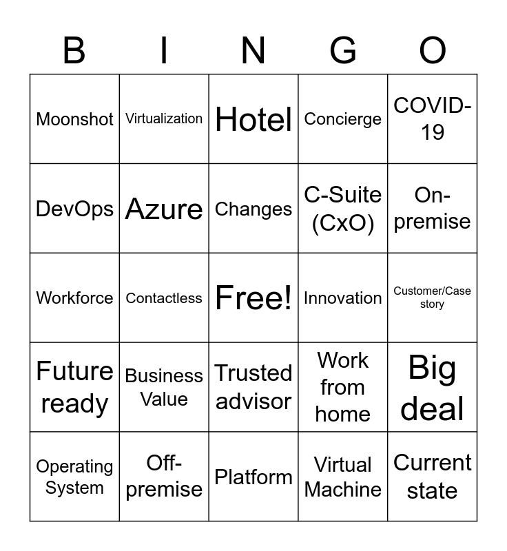This bingo card has a free space and 38 words: Apps, Artificial Intelligence, AWS, Azure, Big deal, Business Value, Changes, Cloud, COVID-19, C-Suite (CxO), Contactless, Concierge, Current state, Customer/Case story, DevOps, Future ready, Google, Hotel, Hybrid Cloud, Innovation, Moonshot, Off-premise, On-premise, Operating System, Pat Gelsinger, Platform, Point of View, Portal, Robot, Security, Solution selling, Trusted advisor, Virtual Machine, Virtualization, VMworld, Work from home, Workforce and Zoom.