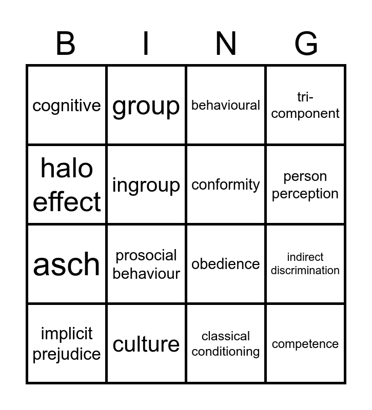 This bingo card has 75 words: classical conditioning, explicit prejudice, behavioural, discrimination, attribution, direct discrimination, attitude, collectivist culture, Free!, affective, cognitive, intergroup contact, person perception, ingroup, outgroup, indirect discrimination, operant conditioning, implicit prejudice, old fashioned prejudice, halo effect, modern prejudice, obedience, conformity, group, tri-component, empathy, repeated exposure, personal attribution, culture, zimbardo, status, mood, social proximity, competence, prosocial behaviour, asch, power, milgram, classical conditioning, explicit prejudice, behavioural, discrimination, attribution, direct discrimination, attitude, collectivist culture, affective, cognitive, intergroup contact, person perception, ingroup, outgroup, indirect discrimination, operant conditioning, implicit prejudice, old fashioned prejudice, halo effect, modern prejudice, obedience, conformity, group, tri-component, empathy, repeated exposure, personal attribution, culture, zimbardo, status, mood, social proximity, competence, prosocial behaviour, asch, power and milgram.