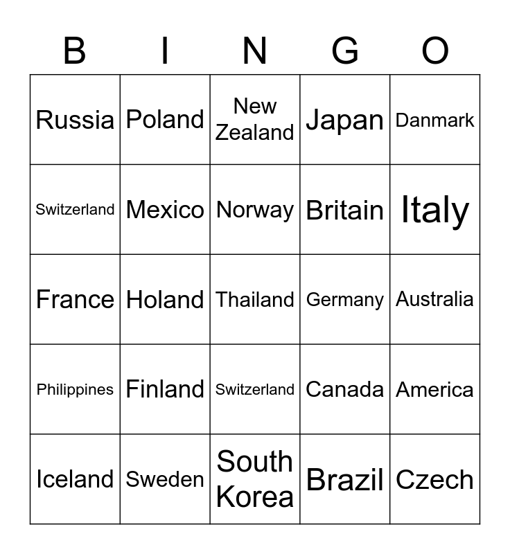This bingo card has a free space and 24 words: Finland, Sweden, Norway, Iceland, Danmark, Russia, Switzerland, Poland, Germany, Switzerland, Britain, France, Canada, America, Mexico, Brazil, Australia, New Zealand, Italy, Holand, Czech, Philippines, Japan and South Korea.