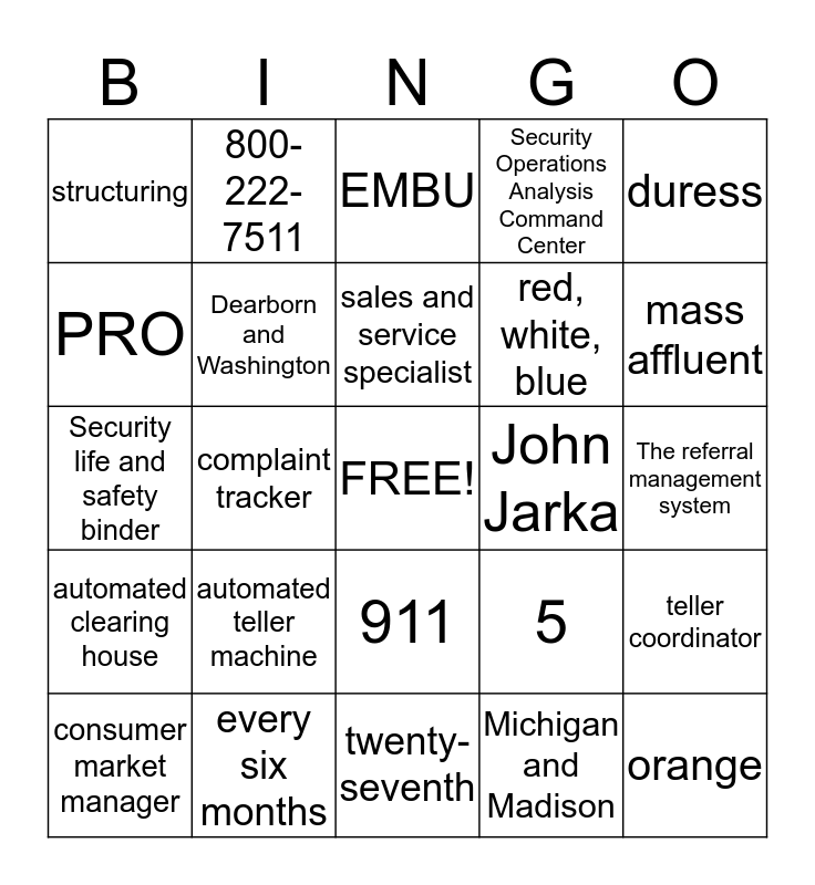 This bingo card has a free space and 24 words: automated teller machine, every six months, sales and service specialist, consumer market manager, duress, structuring, PRO, 800-222-7511, John Jarka, 911, red, white, blue, Security life and safety binder, 5, teller coordinator, Dearborn and Washington, Michigan and Madison, The referral management system, EMBU, mass affluent, complaint tracker, orange, automated clearing house, Security Operations Analysis Command Center and twenty-seventh.
