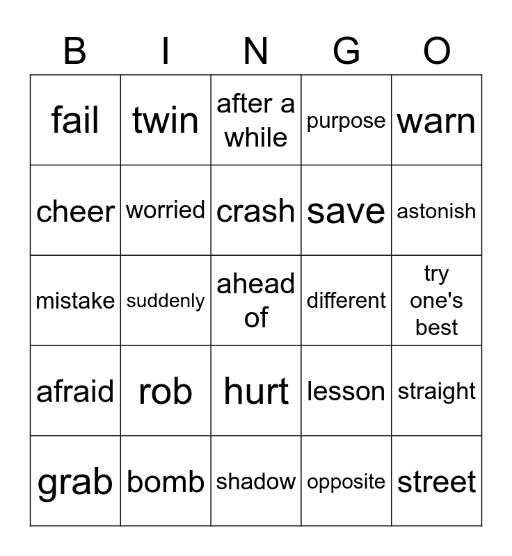 This bingo card has a free space and 24 words: rob, bomb, crash, grab, warn, fail, cheer, twin, different, hurt, save, mistake, lesson, straight, worried, opposite, try one's best, after a while, astonish, suddenly, street, afraid, purpose and shadow.