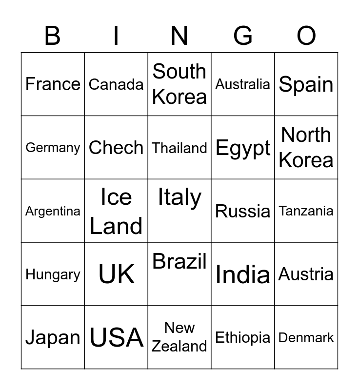 This bingo card has a free space and 24 words: UK, USA, Thailand, Japan, Spain, France, Germany, Canada, Russia, Brazil, Egypt, Argentina, India, Austria, Chech, Ethiopia, Tanzania, South Korea, North Korea, Ice Land, Denmark, Hungary, Australia and New Zealand.