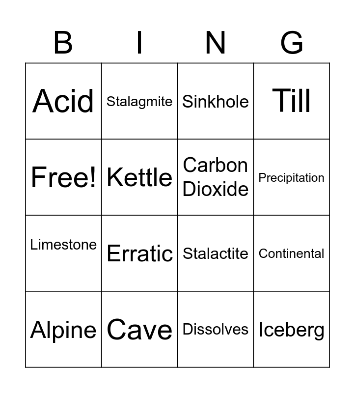 This bingo card has 16 words: Cave, Continental, Sinkhole, Acid, Limestone, Stalagmite, Stalactite, Dissolves, Free!, Kettle, Alpine, Till, Erratic, Precipitation, Carbon Dioxide and Iceberg.
