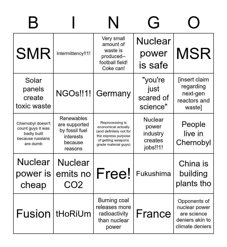 This bingo card has 26 words: Free!, France, Germany, tHoRiUm, MSR, SMR, Solar panels create toxic waste, Intermittency!!1!, People live in Chernobyl, Fukushima, "you're just scared of science", Chernobyl doesn't count guys it was badly built because russians are dumb, China is building plants tho, Fusion, Renewables are supported by fossil fuel interests because reasons, Nuclear power is clean, Nuclear power is safe, Nuclear power is cheap, Very small amount of waste is produced--football field! Coke can!, Reprocessing is economical actually (and definitely not for the express purpose of getting weapons grade material guys), [insert claim regarding next-gen reactors and waste], Burning coal releases more radioactivity than nuclear power, Nuclear power industry creates jobs!!1!, Nuclear emits no CO2, NGOs!!1! and Opponents of nuclear power are science deniers akin to climate deniers.