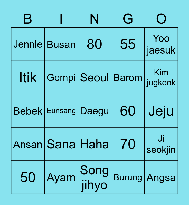 This bingo card has a free space and 24 words: Sana, Ayam, Seoul, 50, Yoo jaesuk, Jennie, Itik, Busan, 60, Haha, Barom, Bebek, 70, Ji seokjin, Gempi, Burung, Jeju, 80, Kim jugkook, Eunsang, Angsa, Ansan, 55 and Song jihyo.
