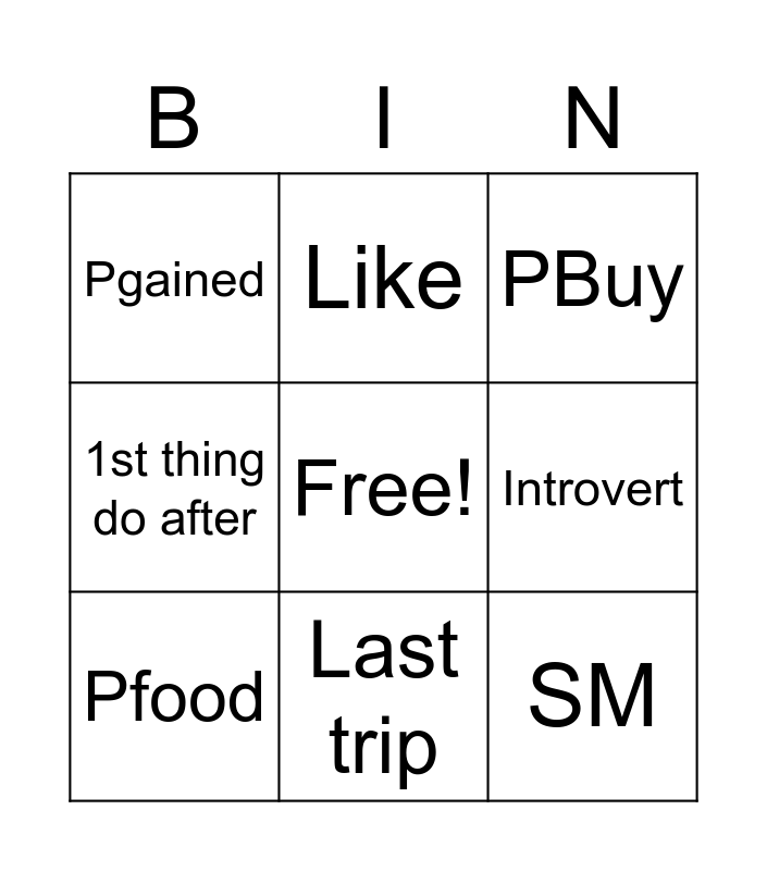 This bingo card has a free space and 8 words: Introvert, PBuy, Like, Pfood, Pgained, SM, 1st thing do after and Last trip.