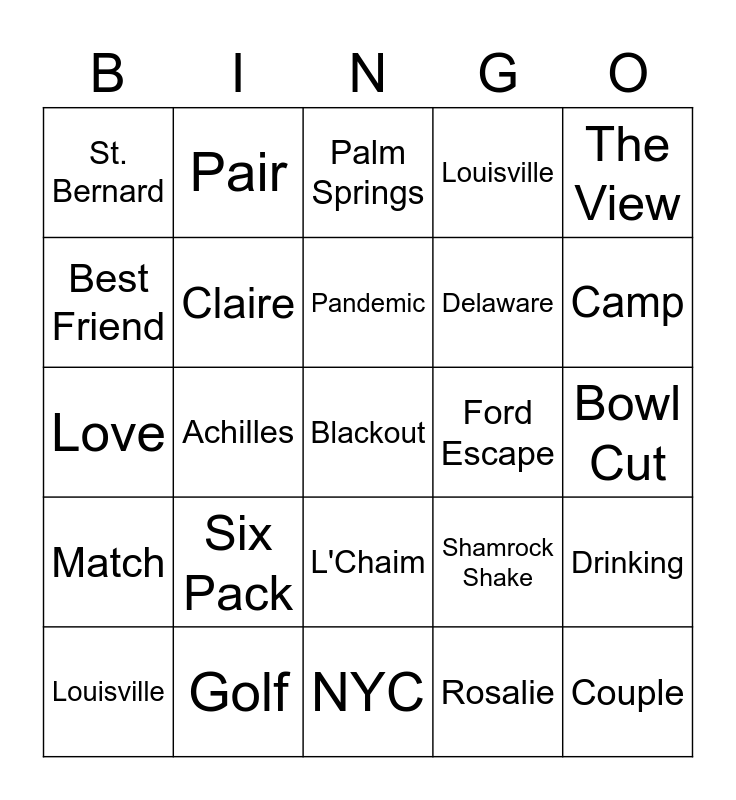 This bingo card has 56 words: Clemson, Louisville, Elle, St. Bernard, NYC, Ramah Darom, Claire, Jonathan, Delaware, COVID, Louisville, Prague, Michigan, 6th Floor Walk-up, Goldman Sachs, The Decider, The View, Achilles, Lasik, Blackout, Ford Escape, Thrasher's, Shamrock Shake, Palm Springs, Honeymoon, Pandemic, Sammy, Sigma Kappa, Camp, Indiana, Kilroy's, Baseball, ROTC, Softball, Bowl Cut, Best Friend, Love, Chevy Chase, Match, Pair, L'Chaim, Couple, Mazel Tov, Back Hair, Blonde, Six Pack, Golf, Quarantine, Ginger, Addie, Rosalie, Gesher, Long Distance, Nivo, Drinking and Basketball.