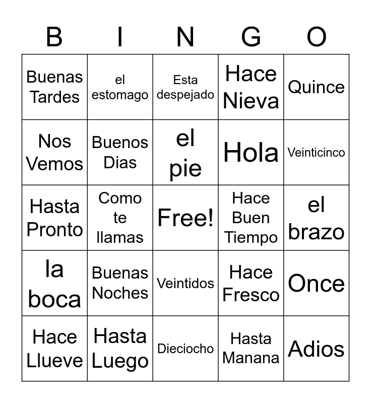 This bingo card has a free space and 24 words: Buenas Noches, Hasta Luego, el pie, Hace Llueve, Quince, Buenas Tardes, Nos Vemos, el estomago, Hace Buen Tiempo, Veintidos, Hola, Hasta Pronto, Hace Fresco, Once, Buenos Dias, Hasta Manana, el brazo, Esta despejado, Veinticinco, Como te llamas, Adios, la boca, Hace Nieva and Dieciocho.