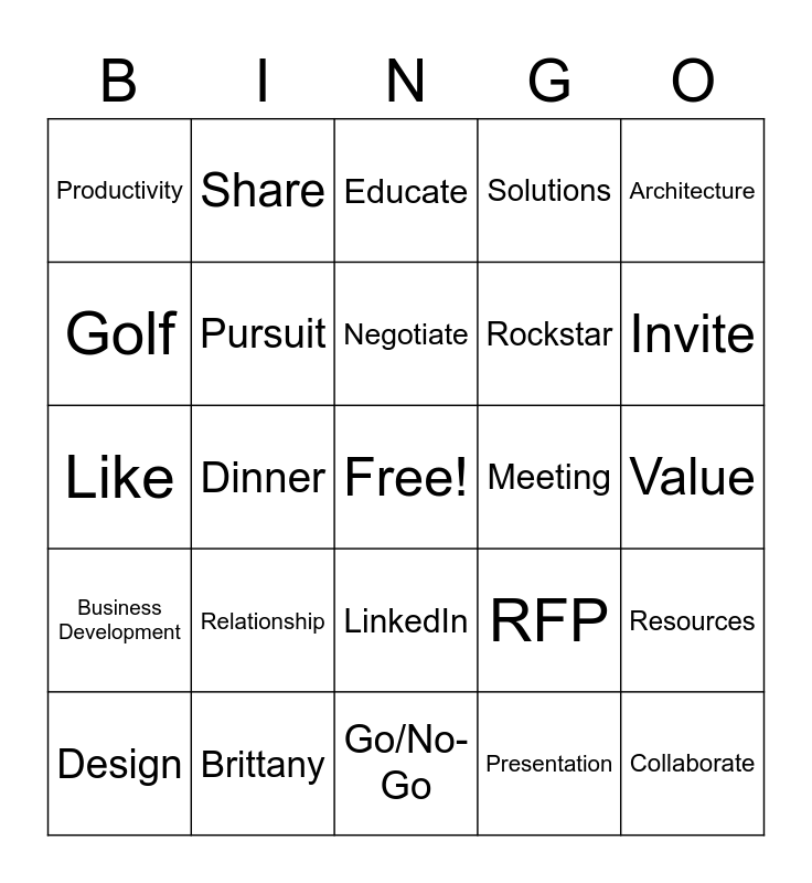 This bingo card has a free space and 27 words: Design, Brittany, Negotiate, Presentation, Invite, Productivity, Share, LinkedIn, Rockstar, Collaborate, Like, Pursuit, Marketing, RFP, Value, Conference, Dinner, Educate, Meeting, Architecture, Business Development, Relationship, Go/No-Go, Solutions, Resources, Golf and Strategy.