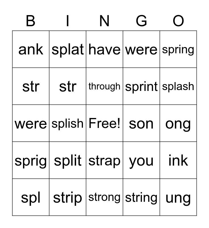 This bingo card has a free space and 24 words: split, strip, through, spl, spring, ank, str, splat, son, strap, sprint, were, you, ink, str, string, ong, have, splash, splish, ung, sprig, were and strong.