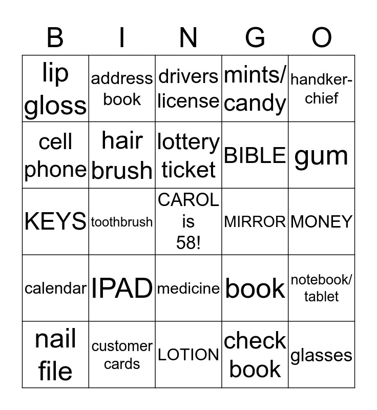 This bingo card has a free space and 24 words: IPAD, customer cards, lottery ticket, nail file, handker- chief, lip gloss, cell phone, address book, MIRROR, medicine, BIBLE, KEYS, book, notebook/ tablet, hair brush, check book, MONEY, drivers license, gum, toothbrush, glasses, calendar, mints/ candy and LOTION.