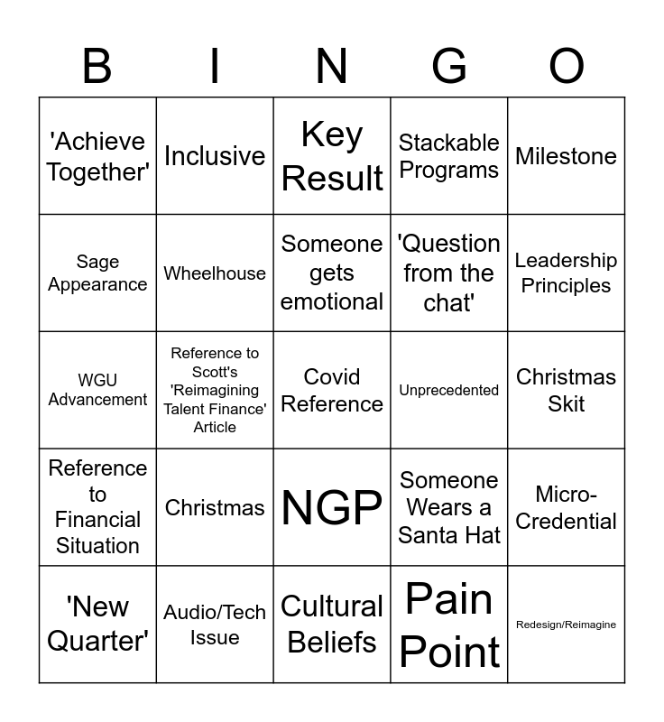 This bingo card has a free space and 24 words: Christmas, Audio/Tech Issue, Someone gets emotional, 'New Quarter', Milestone, 'Achieve Together', Sage Appearance, Inclusive, Unprecedented, NGP, 'Question from the chat', WGU Advancement, Someone Wears a Santa Hat, Micro-Credential, Wheelhouse, Pain Point, Christmas Skit, Key Result, Leadership Principles, Reference to Scott's 'Reimagining Talent Finance' Article, Redesign/Reimagine, Reference to Financial Situation, Stackable Programs and Cultural Beliefs.