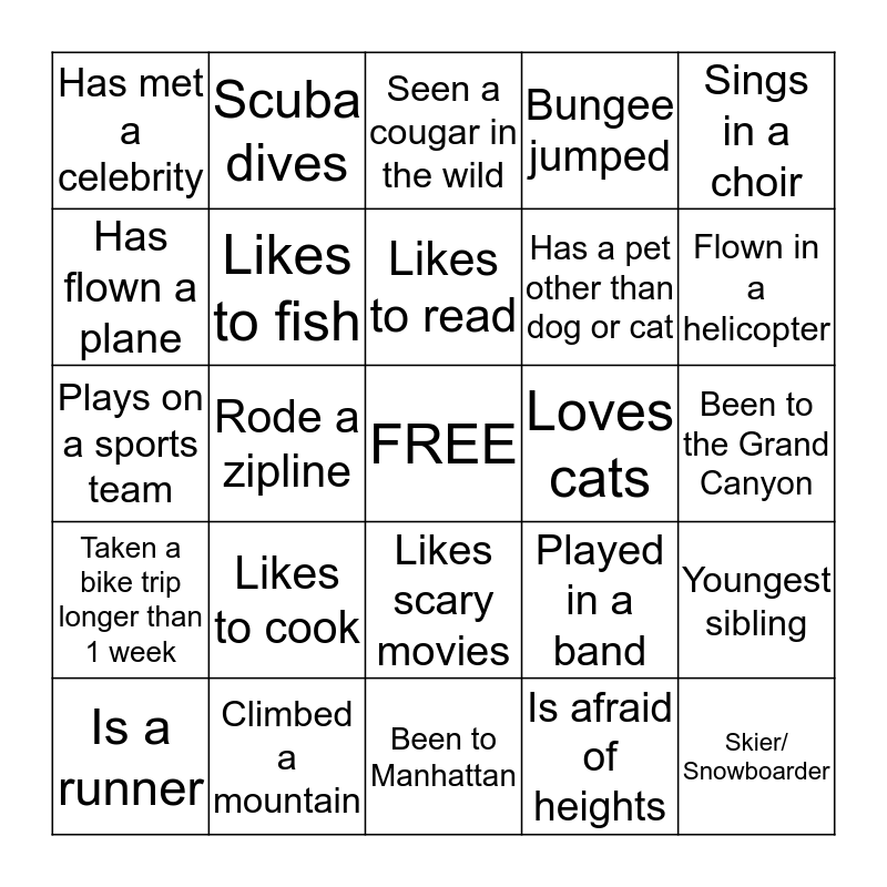 This bingo card has a free space and 24 words: Likes to cook, Climbed a mountain, Likes to read, Is a runner, Sings in a choir, Has met a celebrity, Has flown a plane, Scuba dives, Loves cats, Likes scary movies, Has a pet other than dog or cat, Plays on a sports team, Played in a band, Youngest sibling, Likes to fish, Is afraid of heights, Been to the Grand Canyon, Seen a cougar in the wild, Flown in a helicopter, Rode a zipline, Skier/ Snowboarder, Taken a bike trip longer than 1 week, Bungee jumped and Been to Manhattan.