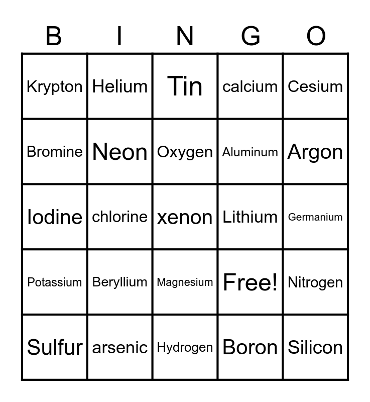 This bingo card has 25 words: Beryllium, Hydrogen, Oxygen, Sulfur, Cesium, Krypton, Bromine, Helium, Lithium, Magnesium, Aluminum, Iodine, Free!, Nitrogen, Neon, Silicon, Germanium, Tin, Argon, chlorine, xenon, arsenic, Potassium, calcium and Boron.