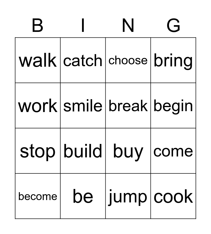 This bingo card has 16 words: be, come, choose, walk, stop, catch, buy, jump, work, smile, become, bring, build, begin, break and cook.