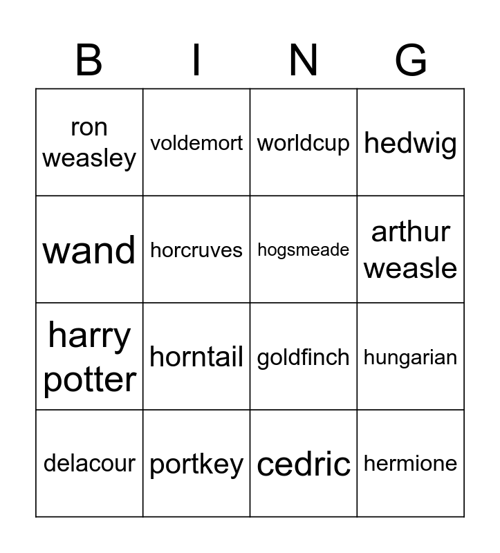 This bingo card has 25 words: goblin, ginny weasley, arthur weasle, broom, wand, ron weasley, horcruves, voldemort, portkey, ministry, harry potter, goldfinch, dementor, wand, hogsmeade, expectopatronum, cedric, worldcup, horntail, hungarian, delacour, fleur, hermione, hedwig and death.
