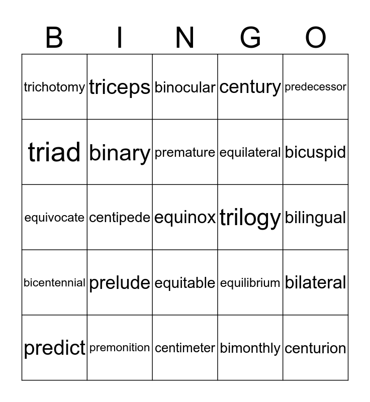 This bingo card has a free space and 24 words: prelude, premonition, premature, predict, predecessor, trichotomy, triad, triceps, trilogy, equitable, equilateral, equivocate, equilibrium, bilateral, binary, bimonthly, bilingual, binocular, bicuspid, centipede, centurion, bicentennial, century and centimeter.