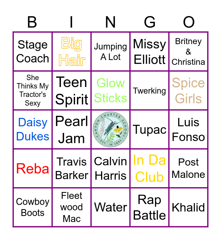 This bingo card has a free space and 85 words: Boot Scootin Boogie, Head Banging, Jumping A Lot, Kendrick Lamar, The Biebs, Water melon Crawl, Mosh Pit, Lasers, Jay Z, Doja Cat, Dolly, Guns n' Roses, Tupac, Spice Girls, Johnny Cash, Big Hair, Calvin Harris, Twerking, Dua Lipa, Cowboy Boots, Queen, Water, In Da Club, Saweetie, She Thinks My Tractor's Sexy, AC/DC, OONZA OONZA OONZA, Biggie, Taylor Swift, Luke Bryan, Fleet wood Mac, Festival Love, Bad Bunny, Britney & Christina, Daisy Dukes, Crowd Surfing, I'm with the DJ, Da Baby, Luis Fonso, Stage Coach, Led Zeppelin, Vegas Pool, All the Lil's, Harry Styles, Reba, The Boss, Air Cannons, Boom box, Lady Gaga, Carrie Underwood, Teen Spirit, Glow Sticks, Sneakers, Billie Eilish, Pickup Truck, Chili Peppers, Levels Avicii, Missy Elliott, Khalid, Bandanas, Sold Out Stadiums, Dead Mau5, Megan Thee Stallion, Lizzo, Kane Brown, Pearl Jam, Daft Punk, Rap Battle, Beyonce, Garth Brooks, Livin on a Prayer, Diplo, Cardi B., The Weekend, Luke Combs, Blink 182, Flume, Travis Scott, BTS, Tailgatin', Travis Barker, Odesza, Chance the Rapper, Post Malone and Miley Cirus.