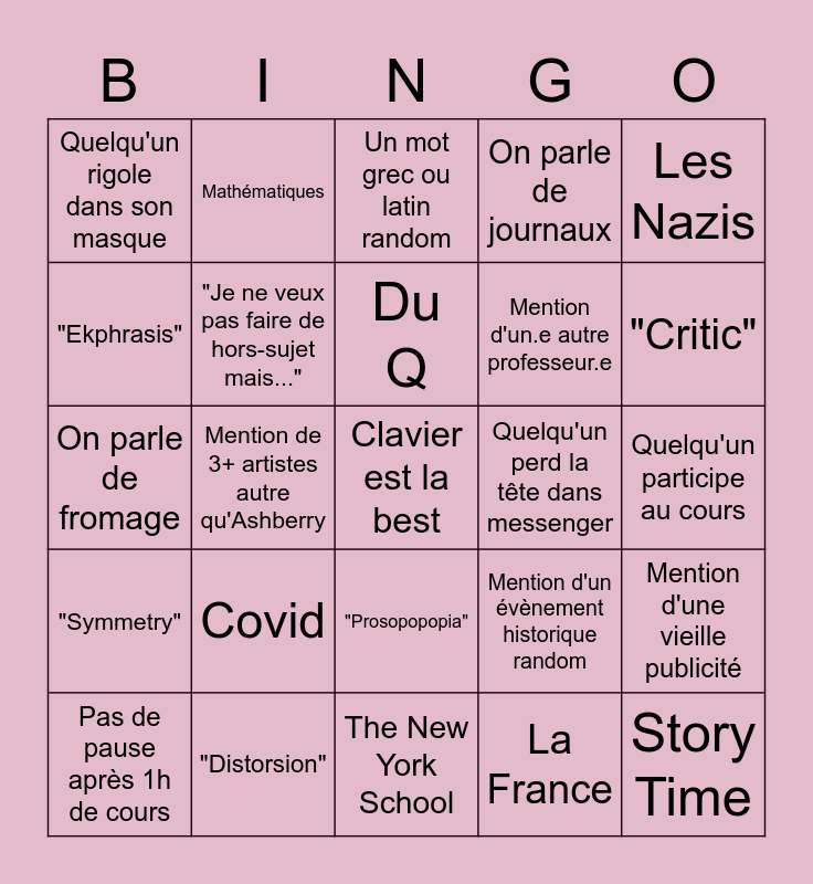 This bingo card has a free space and 25 words: Covid, The New York School, Du Q, Pas de pause après 1h de cours, Les Nazis, Quelqu'un rigole dans son masque, "Ekphrasis", Mathématiques, Quelqu'un perd la tête dans messenger, "Prosopopopia", Mention d'un.e autre professeur.e, On parle de fromage, Mention d'un évènement historique random, Mention d'une vieille publicité, "Je ne veux pas faire de hors-sujet mais...", Un italien, Quelqu'un participe au cours, Un mot grec ou latin random, "Critic", Mention de 3+ artistes autre qu'Ashberry, Story Time, "Distorsion", "Symmetry", On parle de journaux and La France.