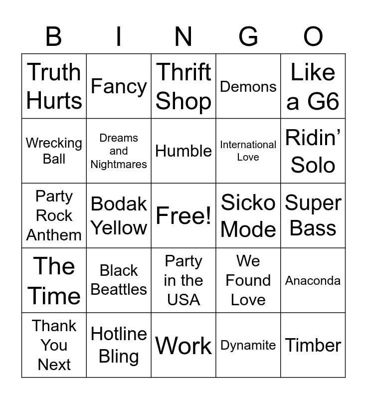 This bingo card has a free space and 29 words: Thank You Next, Formation, Bodak Yellow, Old Town Road, Truth Hurts, Thrift Shop, Dreams and Nightmares, Black Beattles, Sicko Mode, Hotline Bling, Super Bass, Timber, Work, Dynamite, Ridin’ Solo, Club Can’t Handle Me, Party in the USA, The Time, Like a G6, Party Rock Anthem, We Found Love, Payphone, International Love, Wrecking Ball, Demons, Fancy, Anaconda, Humble and Bad and Boujiee.