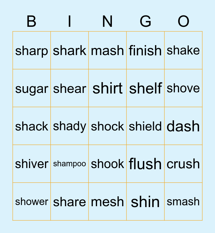 This bingo card has a free space and 24 words: shampoo, share, shirt, shower, shake, sharp, sugar, shark, shield, shook, shelf, shack, flush, crush, shear, shin, dash, mash, shove, shady, smash, shiver, finish and mesh.