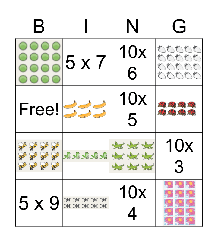 This bingo card has 9 images and 7 words: 10x 3, 10x 6, 5 x 7, 10x 4, Free!, 5 x 9 and 10x 5.