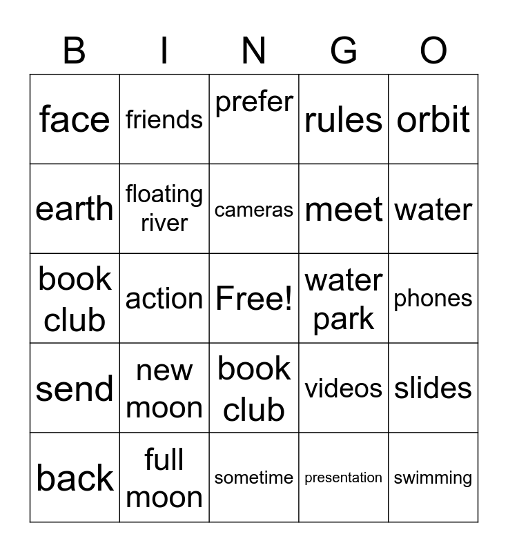 This bingo card has a free space and 24 words: new moon, full moon, cameras, back, orbit, face, earth, friends, water park, book club, meet, book club, videos, slides, floating river, presentation, phones, prefer, water, action, swimming, send, rules and sometime.