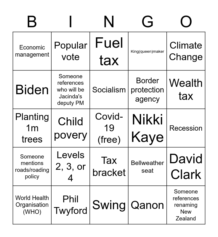This bingo card has a free space and 121 words: Gareth Morgan, TOP Surge, Universal basic income, Cats, Strong & stable, Coalition of losers, Popular vote, MMP, Bellweather seat, Someone references renaming New Zealand, Reduce prison population, Treaty settlements, Someone references N.Z. becoming a republic, Someone references polling, House prices, Public transport, Tax bracket, Someone references that both PM contenders are women, Special votes, Advance voting, Capitalism, Socialism, Communism, United Nations (UN), "Say nope to dope", Someone references giving 16yo the vote, Far-right, "Too close to call", "The people have spoken", Overhang, "Three more years!", Swing, King(queen)maker, Turnout, Safe seat, Moving ports of Auckland, Provincial growth fund, Northland, Minister of Racing, Shane Jones, Winston Peters denies something, Dr. Shane Reti, Someone references Judith's Samoan husband, Flag Referendum, Someone mentions roads/roading policy, Horicultural specialists, Strike Force Raptor, Border protection agency, John Key, $11b hole, Paul Goldsmith, Amy Adams, Nikki Kaye, Tax cuts, Raise GST, Someone references rebuilding Christchurch, Someone references obsesity being a choice, Waikato Medical School, Reform the RMA, Economic management, Auckland Central, Kiwibuild, Jacindamania, Celebrity PM, Kelvin Davis, Someone references who will be Jacinda's deputy PM, Let's do this, Let's keep moving, David Clark, Chinese sounding surnames, Phil Twyford, No new taxes, CGT, Someone mentions Neve by name or by reference, Gun buyback, Child povery, Someone references Jacinda smoking weed, Government CTO, Ihumatao, Planting 1m trees, Parliaments new playground, Fuel tax, Helen Clark, Comrade, New public holiday, Green School, Chloe Swarbrick, Tax is love, Wealth tax, Electric Vehicles, Oil and gas exploration, Matariki, Qanon, 5G, Five eyes, Ban 1080, Someone references SFO investigations, Climate Emergency, Climate Change, Pike River, Habour bridge, Census, Climate Strikes, Trump, Biden, Obama, Clinton, Covid-19 (free), Lockdown, Travel bubble, Wage subsidy, Ashley Bloomfield, Foreign students, Recession, World Health Organisation (WHO), Levels 2, 3, or 4, Someone references dancing with the stars, Own your future, Taxpayers union, Don Brash and Epsom.