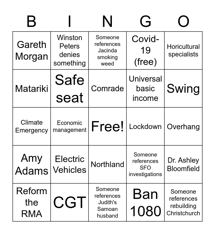 This bingo card has a free space and 124 words: "Say nope to dope", "The people have spoken", "Three more years!", "Too close to call", $11b hole, Advance voting, Amy Adams, Auckland Central, Ban 1080, Barack Obama, Bellweather seat, Bernie Sanders, Border protection agency, Capitalism, Celebrity PM, Census, CGT, Child povery, Chinese sounding surnames, Chloe Swarbrick, Climate Change, Climate Emergency, Climate Strikes, Coalition of losers, Communism, Comrade, Covid-19 (free), David Clark, Don Brash, Donald Trump, Dr. Ashley Bloomfield, Dr. Shane Reti, Economic management, Electric Vehicles, Epsom, Far-right, Five eyes, Flag Referendum, Foreign students, Fuel tax, Gareth Morgan, Government CTO, Green School, Gun buyback, Harbour bridge, Helen Clark, Hilary Clinton, Horicultural specialists, House prices, Ihumatao, Jacindamania, Joe Biden, John Key, Kelvin Davis, King(queen)maker, Kiwibuild, Let's do this, Let's keep moving, Levels 2, 3, or 4, Lockdown, Matariki, Minister of Racing, MMP, Moving ports of Auckland, New public holiday, Nikki Kaye, No new taxes, Northland, Oil and gas exploration, Overhang, Own your future, Parliaments new playground, Paul Goldsmith, Phil Twyford, Pike River, Planting 1m trees, Popular vote, Provincial growth fund, Public transport, QAnon, Raise GST, Recession, Reduce prison population, Reform the RMA, Safe seat, Shane Jones, Simon Bridges, Socialism, Someone mentions Neve by name or by reference, Someone mentions roads/roading policy, Someone references 5G, Someone references cats, Someone references dancing with the stars, Someone references giving 16yo the vote, Someone references Jacinda smoking weed, Someone references Judith's Samoan husband, Someone references N.Z. becoming a republic, Someone references obsesity being a choice, Someone references polling, Someone references rebuilding Christchurch, Someone references renaming New Zealand, Someone references SFO investigations, Someone references that both PM contenders are women, Someone references who will be Jacinda's deputy PM, Special votes, Strike Force Raptor, Strong & stable, Swing, Tax bracket, Tax cuts, Tax is love, Taxpayers union, Todd Muller, TOP Surge, Travel bubble, Treaty settlements, Turn out, United Nations (UN), Universal basic income, Wage subsidy, Waikato Medical School, Wealth tax, Winston Peters denies something and World Health Organisation (WHO).
