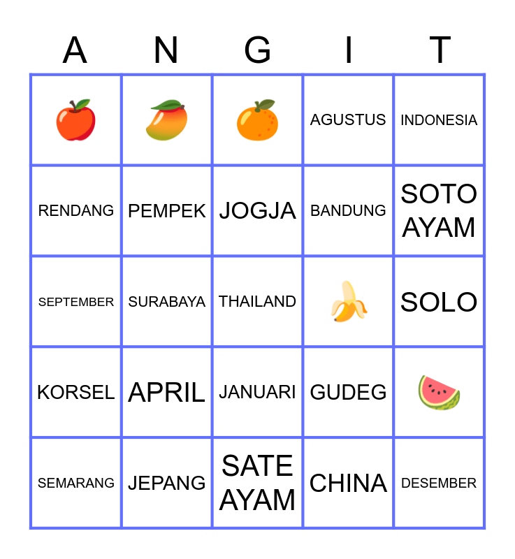 This bingo card has 25 words: KORSEL, JEPANG, THAILAND, CHINA, INDONESIA, 🍎, 🥭, 🍊, 🍌, 🍉, RENDANG, PEMPEK, SATE AYAM, GUDEG, SOTO AYAM, SEMARANG, SURABAYA, JOGJA, BANDUNG, SOLO, SEPTEMBER, APRIL, JANUARI, AGUSTUS and DESEMBER.