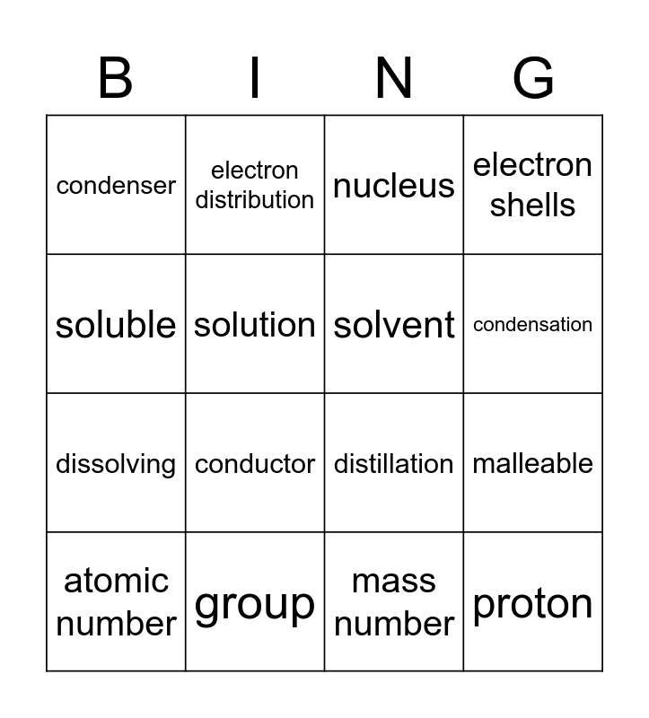 This bingo card has 16 words: group, malleable, nucleus, condenser, dissolving, electron distribution, distillation, mass number, soluble, solution, atomic number, electron shells, conductor, condensation, solvent and proton.