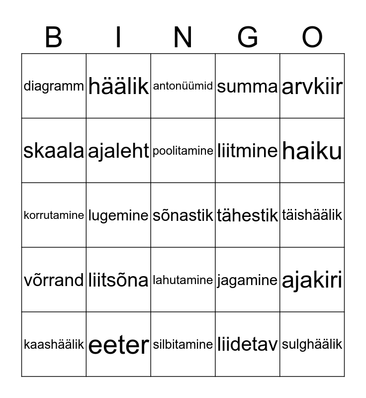 This bingo card has 25 words: liitsõna, silbitamine, poolitamine, kaashäälik, arvkiir, diagramm, skaala, häälik, tähestik, lahutamine, liitmine, korrutamine, jagamine, ajakiri, ajaleht, sulghäälik, täishäälik, antonüümid, haiku, lugemine, sõnastik, eeter, võrrand, summa and liidetav.