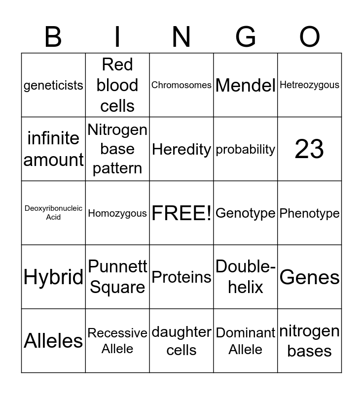 This bingo card has a free space and 32 words: Dominant Allele, Adenine, Homozygous, Guanine, Hybrid, Nitrogen base pattern, Hetreozygous, Genes, Red blood cells, Genetic code, Heredity, Chromosomes, DNA Replication, Purebred, Genotype, Nucleus, Alleles, Deoxyribonucleic Acid, Proteins, Punnett Square, Double-helix, Pedigree, Phenotype, Recessive Allele, nitrogen bases, Mendel, probability, infinite amount, geneticists, daughter cells, 46 and 23.