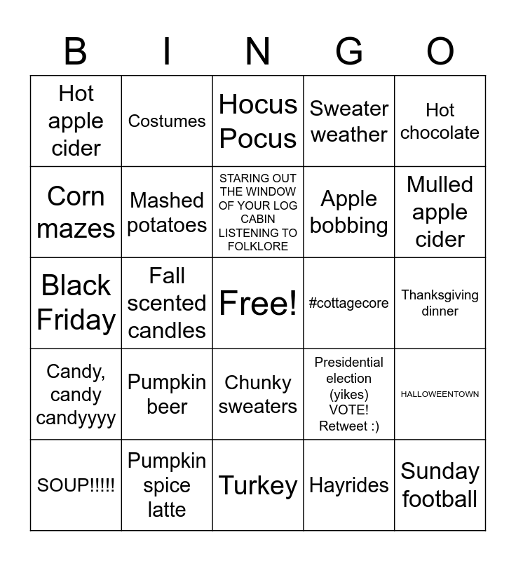 This bingo card has a free space and 53 words: Pumpkin picking, Sunday football, Plaid shirts, Hayrides, Pumpkin beer, Ghosts, goblins, witches, Costumes, Roasted corn, Corn mazes, Getting pelted in the head with acorns, Mashed potatoes, Fall boots, HALLOWEENTOWN, Presidential election (yikes) VOTE! Retweet :), Saying goodbye to your fav summer Rose, SOUP!!!!!, STARING OUT THE WINDOW OF YOUR LOG CABIN LISTENING TO FOLKLORE, #cottagecore, Getting mad because stores put Christmas decor out in October and try to skip Thanksgiving, Hot chocolate, Fall scented candles, Apple picking, Apple bobbing, Hot apple cider, Apple cider donuts, Pumpkin spice latte, Carving + decorating pumpkins, Jack-o-lanterns, Trick or treating, Mulled apple cider, Caramel dipped apples, Pumpkin pie, Apple pie, Leaves changing, Fall foliage hike, Jumping in leaf piles, Sweater weather, Turkey, Hocus Pocus, Haunted Houses, Scary movies, Cranberry sauce, Thanksgiving dinner, Football, The nightmare before Christmas, Chunky sweaters, Firepits, Mulled wine, Black Friday, Candy, candy candyyyy, Candy corn, Beanies and Chunky scarves.