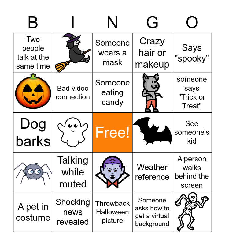 This bingo card has 8 images, a free space and 16 words: Talking while muted, Shocking news revealed, Someone eating candy, A pet in costume, Says "spooky", Two people talk at the same time, Dog barks, Weather reference, A person walks behind the screen, Bad video connection, Someone asks how to get a virtual background, See someone's kid, Someone wears a mask, someone says "Trick or Treat", Crazy hair or makeup and Throwback Halloween picture.