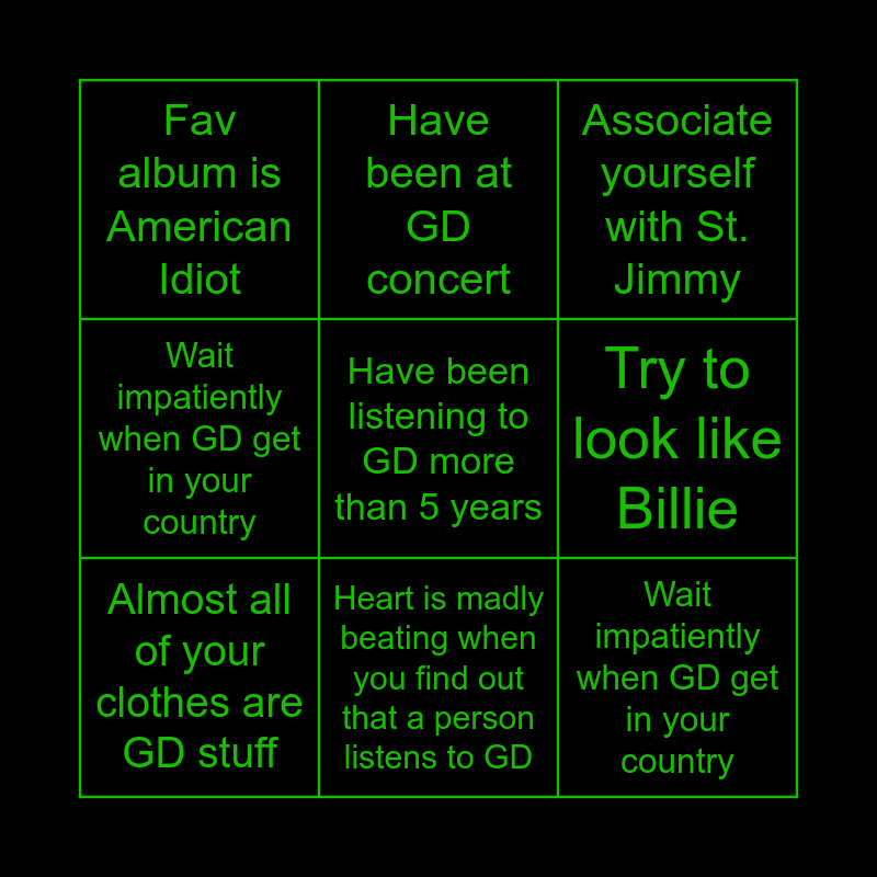 This bingo card has 10 words: Heart is madly beating when you find out that a person listens to GD, Associate yourself with St. Jimmy, Fav album is American Idiot, Have been listening to GD more than 5 years, Wait impatiently when GD get in your country, Almost all of your clothes are GD stuff, Have been at GD concert, People around can't get your musical taste, Try to look like Billie and Wait impatiently when GD get in your country.