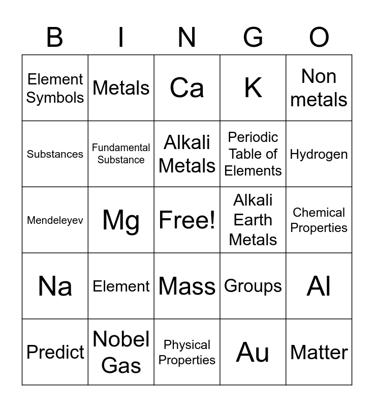 This bingo card has a free space and 24 words: Element, Nobel Gas, Alkali Metals, Predict, Non metals, Element Symbols, Substances, Metals, Alkali Earth Metals, Mass, Periodic Table of Elements, Mendeleyev, Groups, Al, Fundamental Substance, Au, Chemical Properties, Ca, Hydrogen, Mg, Matter, Na, K and Physical Properties.