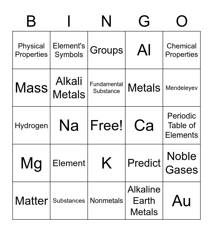This bingo card has a free space and 24 words: Element, Substances, Fundamental Substance, Matter, Chemical Properties, Physical Properties, Mass, Element's Symbols, Ca, K, Metals, Hydrogen, Predict, Noble Gases, Alkali Metals, Alkaline Earth Metals, Periodic Table of Elements, Groups, Mendeleyev, Na, Au, Mg, Al and Nonmetals.