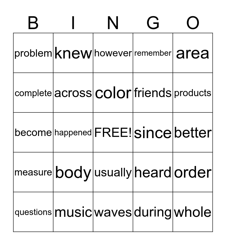 This bingo card has a free space and 24 words: body, music, color, questions, area, problem, complete, knew, since, usually, friends, become, heard, order, across, during, better, however, products, happened, whole, measure, remember and waves.