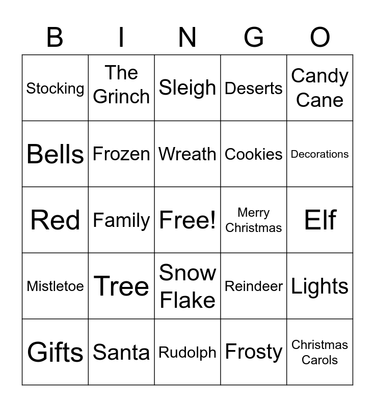This bingo card has a free space and 24 words: Tree, Santa, Wreath, Gifts, Candy Cane, Stocking, Bells, The Grinch, Merry Christmas, Snow Flake, Cookies, Red, Reindeer, Lights, Frozen, Frosty, Elf, Sleigh, Decorations, Family, Christmas Carols, Mistletoe, Deserts and Rudolph.