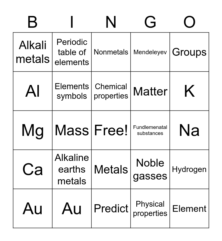 This bingo card has a free space and 24 words: Au, Alkaline earths metals, Chemical properties, Physical properties, Groups, Alkali metals, Periodic table of elements, Nonmetals, Fundlemenatal substances, Na, Mg, Elements symbols, Noble gasses, Hydrogen, Al, Au, Predict, Mendeleyev, K, Ca, Mass, Metals, Matter and Element.
