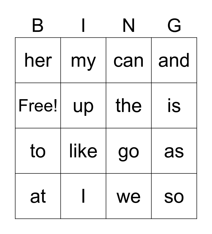 This bingo card has 16 words: I, as, can, her, to, my, go, we, Free!, up, at, and, like, is, the and so.